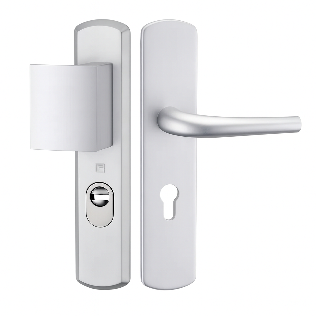 Usage : Le modèle le plus courant pour porte d'appartement ou de maison. Côté rue : plaque avec cylindre protégé. Côté intérieur : poignée pour ouvrir facilement.